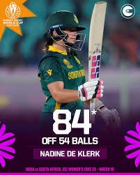 · Nadine de Klerk played an innings to rank alongside any by Albie Morkel or Lance Klusener in the World Cup match against India. Power-hitting isn’t something readily associated with Women’s Cricket but, given the apparent hopelessness of the situation and the context of a World Cup, it didn’t just win the game – it won, and will win, hundreds of thousands of new followers to the Women’s game.