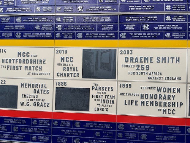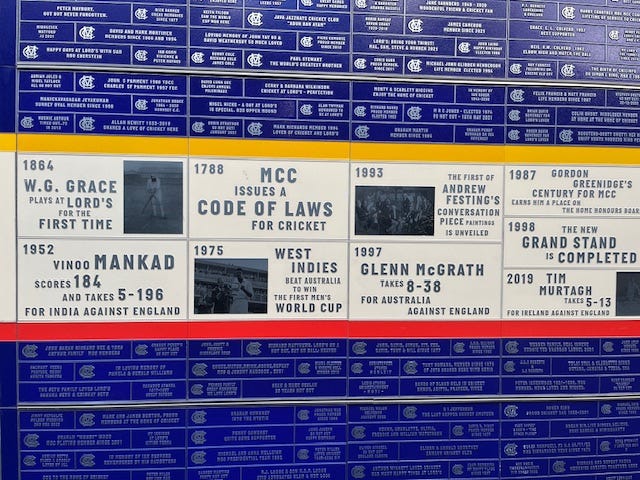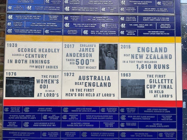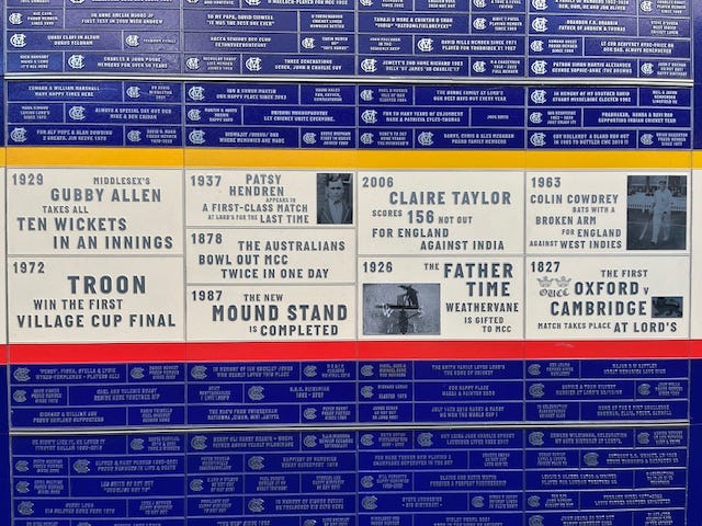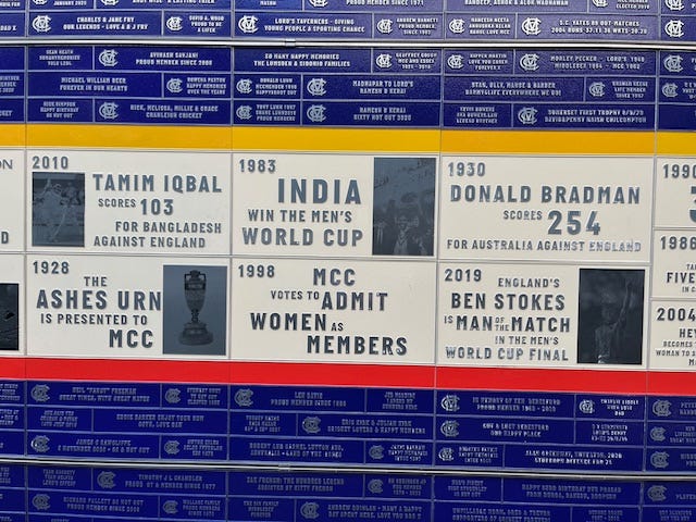 The photographs, by the way, are of the recently created ‘Time Wall’ – or ‘Father Time Wall’ – which celebrates the 100 greatest moments at the Home of Cricket since it began. To date. It will be constantly updated. A lovely touch and an opportunity to lose yourself in history during breaks in play or even quiet periods, of which there were several on Thursday. And may be several more over the next few days. Administrators pitches, and all that.