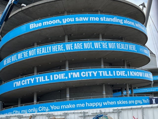 Anyway, my umpteenth visit to Manchester taught me something new. Having assumed for 30 years that Manchester United were the ‘popular’ team in the city and ‘City’ the poor cousin, I was ferociously corrected by at least a dozen Mancunians who informed me that ‘at least’ 75% of the city supported the Blues.
