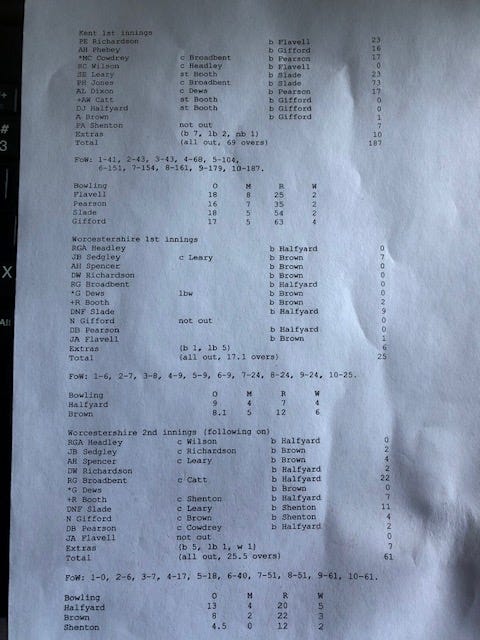 It was the days of uncovered pitches, he explained, to my astonishment. Here we were in 1988, and he played first-class cricket on uncovered pitches? By the time Worcestershire batted conditions were farcical, and they were bowled out for 25 and 61 to lose by an innings and 101 runs! I asked whether he took any wickets, at least, and he said: “A few, yes (4-63) but I made a smashing nought not out in our first innings…”